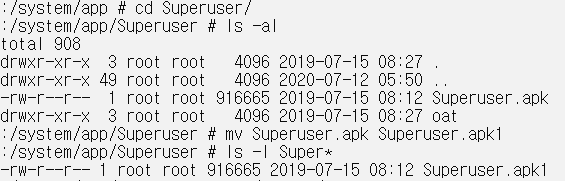 - 앱을 이용하여 루팅하는 방법 : Superuser.apk를 삭제한 후 다시 로그인하려면 SuperSU.apk 어플이 필요