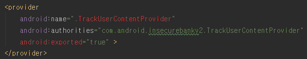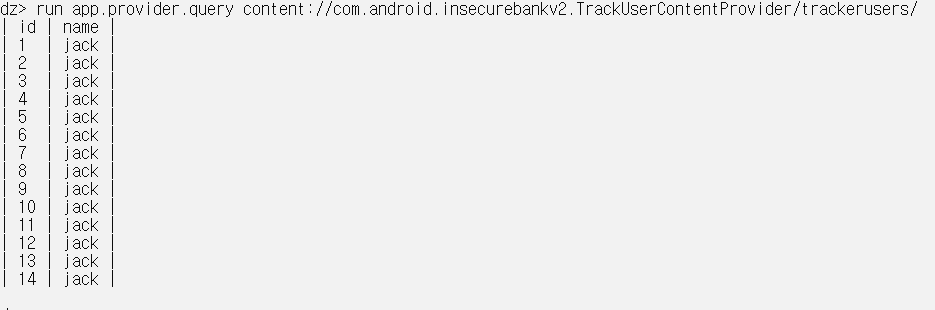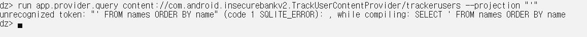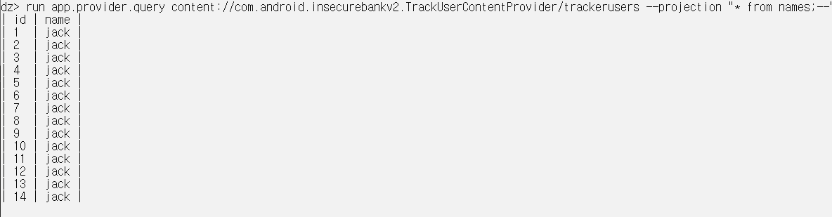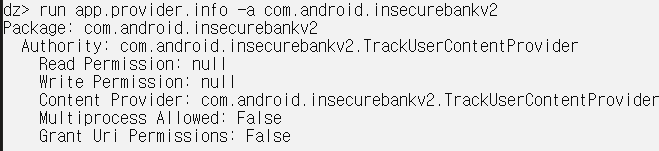 - 콘텐츠 프로바이더는 대상 앱의 데베나 데이터 등을 확인할 수 있다고 했으므로 드로저를 이용하여 SQL Injection이나 경로 탐색도 가능