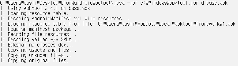 - adb pull 명령어를 사용하여 앱을 apk 파일로 추출한 후 apktool 툴을 사용하여 실질적인 디컴파일 필요