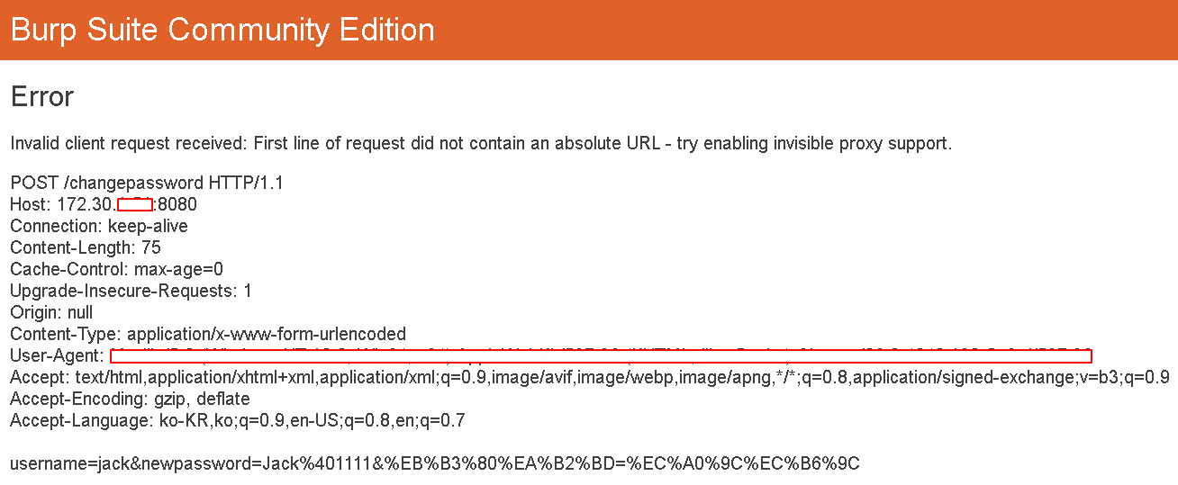 비밀번호 변경 페이지에서 변경하는 걸 버프스위트에서 가로채서 확인