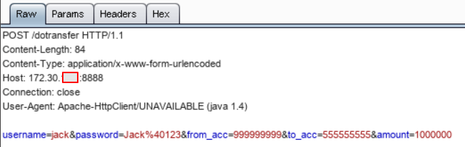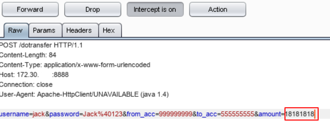 transfer 페이지에서 값 입력 후 버프스위트 확인하면 평문 전송되는 것 확인 가능