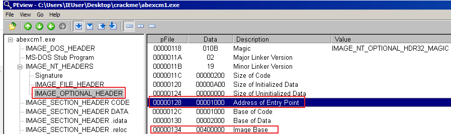 PE 구조의 모든 실행 파일은 헤더 영역에 엔트리 포인트가 상대 주소로 지정되어 있으며 프로그램이 로딩되면서 베이스주소가 지정되어 있고 메모리에 베이스 주소(Image Base)와 상대 주소(Address of Entry Point)가 더해진 위치에 데이터가 저장 됨