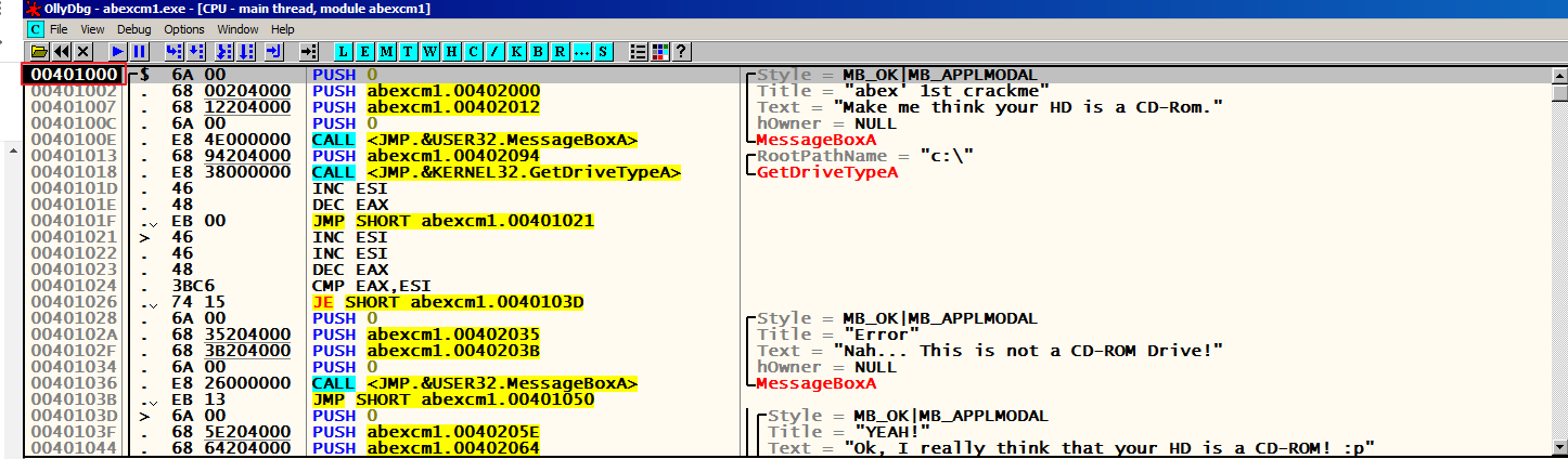 확대해서 다시 보면 시작 포인트가 00401000 인 것을 확인 가능
