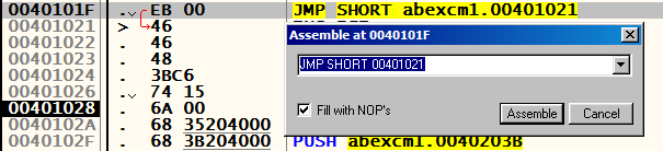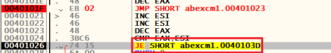 JMP문 때문에 INC 두 개를 건너뛰고 바로 EAX를 감소하러 왔다.
