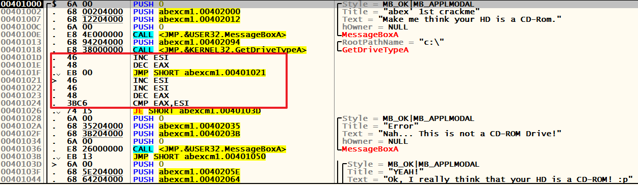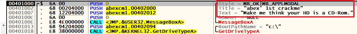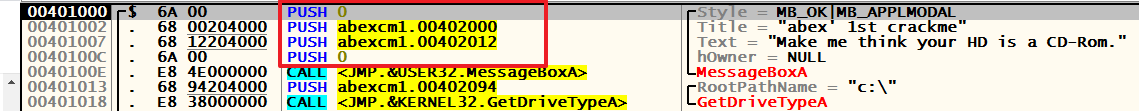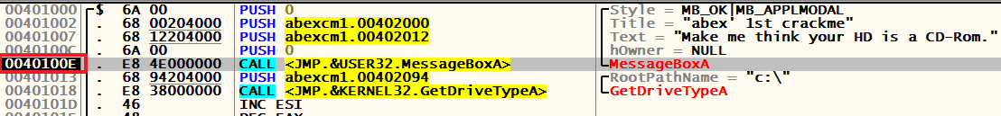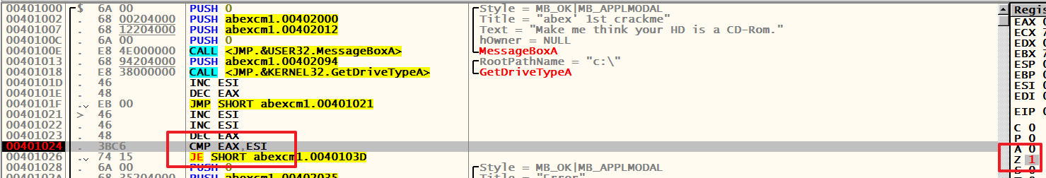 GetDriveTypeA() 함수 호출, 함수 반환값은 EAX에 저장됨 왜? 모름 일단 그런거라고 알고 있겠음 -> 아 F8로 실행하다보면 메시지박스 띄어지면서 EAX가 1로 됨, 이게 함수 반환값이 저장되는 것인가 봄