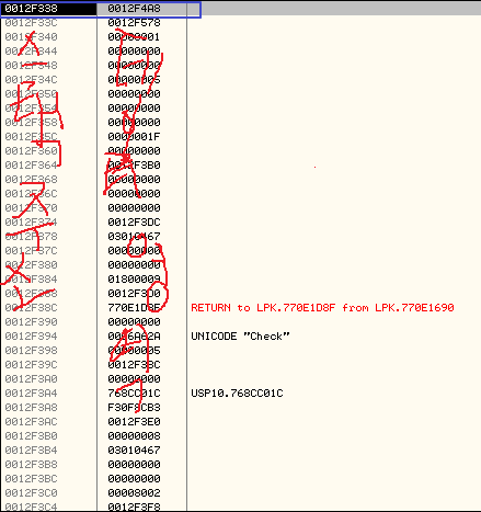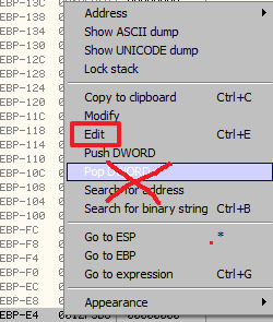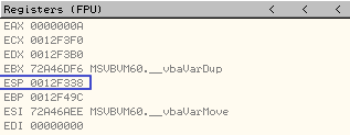 ESP(0012F338) : 현재 사용하는 스택의 맨 위의 주소가 저장되는 레지스터, pop과 push가 실행되면 ESP 레지스터에 저장된 값은 스택을 증가하거나 감소함