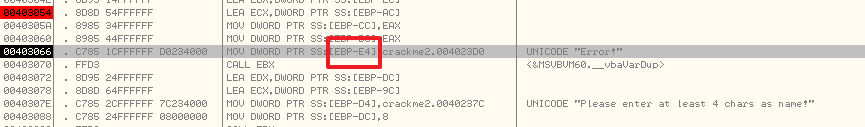 스택의 [EBP-E4]에는 "Error!" 문자열이 저장된 주소인 004023D0이 들어가 있음