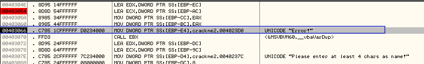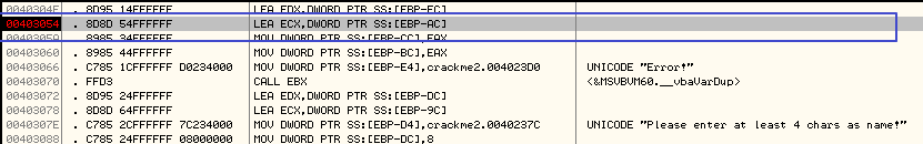 주소 0040237C에는 "Please enter at least 4 chars as name!"이 존재