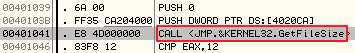 결과값은 EAX 레지스터에 저장하고 파일 크기가 12(12는 16진수, 10진수로는 18)인지 확인함